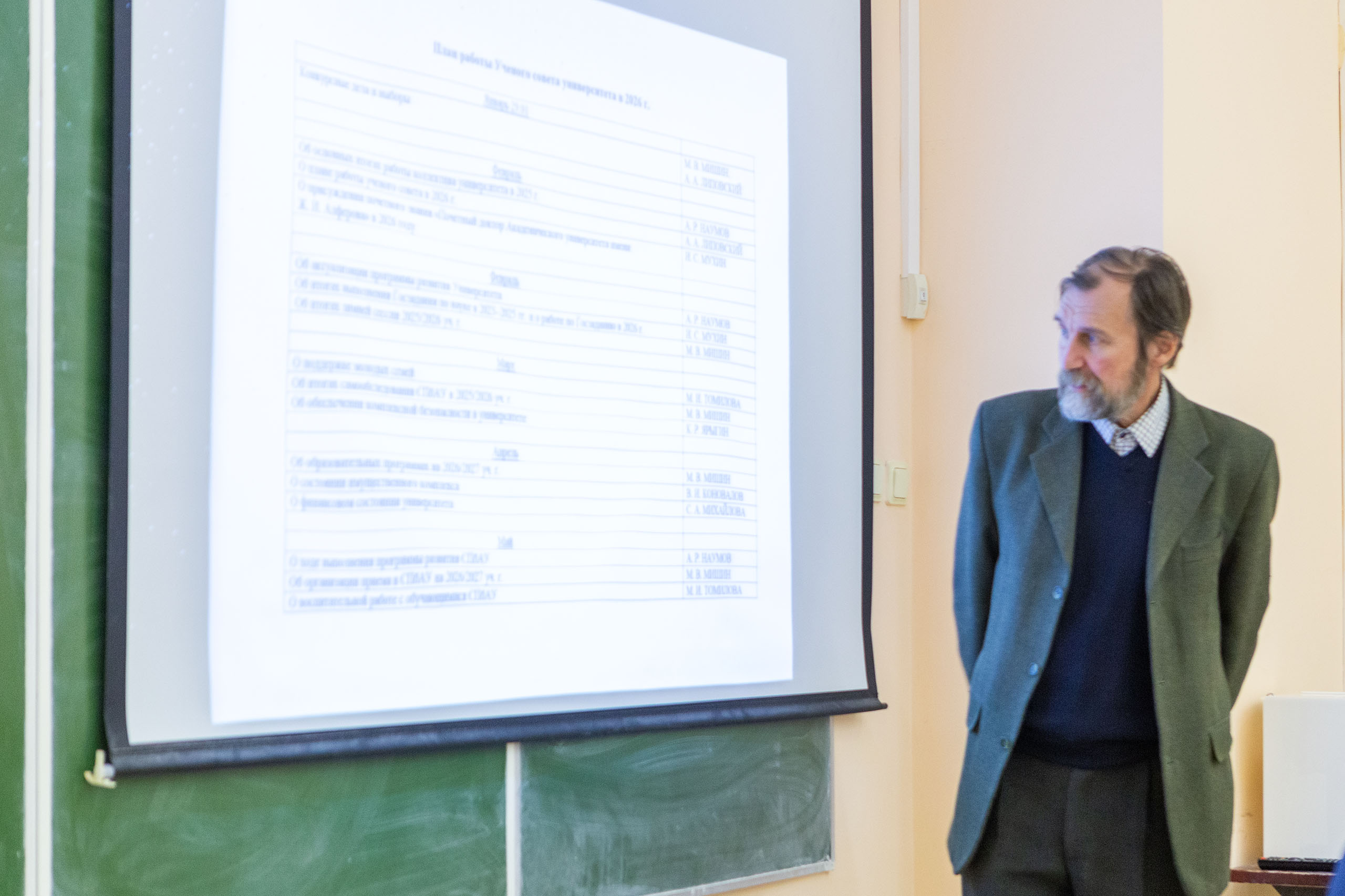 Проректор по науке Иван Мухин представил кандидатуру для присвоения почётного звания «Почётный доктор Академического университета имени Ж. И. Алфёрова». Ответственный секретарь Учёного совета Александр Липовский представил план работы Совета на 2026 год.